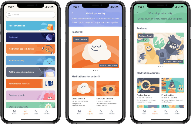 With its swift meditations and soothing color scheme, Aura is designed to help you meditate on the go. With a daily three-minute meditation, the app makes it easy to quickly dive in without spending much time, and other mindfulness features like nature sounds and recorded life coaching sessions add extra elements. Aura also curates recommendations based on your mood or other factors, whips up playlists based on themes and emotions.